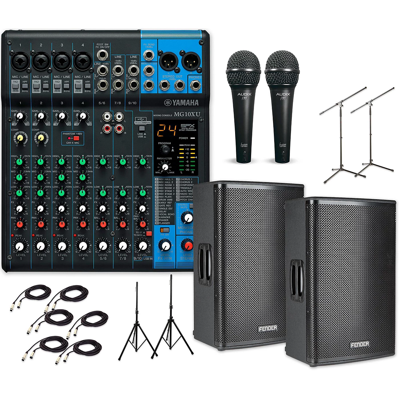 Fender’s Fortis Series are a superb offering in the ever-important category of active speakers. They are affordable, lightweight, powerful and rich in features, and their introduction has inspired a series of PA packages that have the Fortis active speaker as their centerpiece. This package features the Fender Fortis F-15BT, a 1300-watt powered speaker with a 15” low frequency driver, a 1.75” titanium diaphragm compression driver and Bluetooth streaming capability. It also includes a Yamaha MG-10XU and an accessories package. Fortis F-15BTCombining the power of streaming technology and versatile design with user-friendly features, the F-15BT is 1,300W of audio power packed into a lightweight package. With a wide variety of I/O connections, the three-channel F-15BT can handle almost any source you send to it, even offering high-quality stereo Bluetooth audio for wirelessly streaming music from any Bluetooth source. Channel One is dedicated to line-level signals while Channel Two accepts line- and mic-level signals. Channels One and Two are fed by discrete balanced XLR-1/4” TRS combo connectors while Channel Three offers stereo Bluetooth and 3.5mm auxiliary inputs. Powered by dual onboard Class ‘D’ amplifiers, the 1.75” titanium horn-loaded driver and 12” woofer work in tandem to create crystal-clear room-filling sound with a 40°x90° dispersion pattern. Yamaha MG-10XU The MG10XU is the ten-channel mixer with four mono XLR and 1/4″ hybrid inputs along with three stereo line inputs. It has a full complement of effects, three bands of EQ on the first four channels, with effects available on all channels. It supplies phantom power and has a low-noise, clear and present output. The MG10XU boasts an intuitive interface with capacities suitable for a diverse range of users and applications. The solid construction and flexible design of these consoles lets you shape your sound with confidence, continually delivering peak performance and a level of sound quality and reliability that has made it a leader in its class. Accessories packageThis PA package is complemented by a selection of well-built accessories that will make your stage setup easy. Two Audix FS5 cardioid dynamic microphones are included, as well a pair of Musician’s Gear tripod boom microphone stands. Your new Fortis PA speakers can sit safely and securely atop a pair of Musician’s Gear tripod speaker stands, and all of the cables you need to get set up are included as well, in this case, six 20’ XLR to XLR cables.