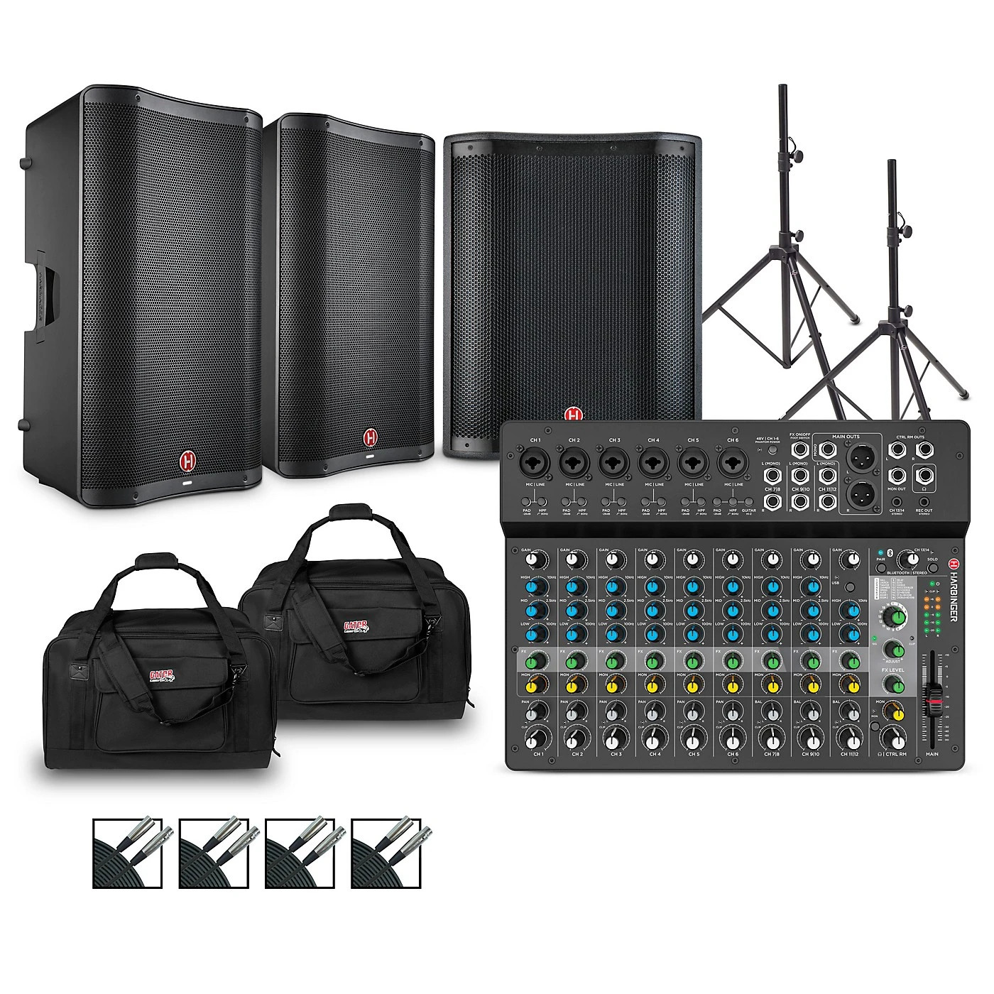 The Harbinger LV14 is a Bluetooth-enabled 14-channel mixer that is ideal for both live and studio applications, providing a wide variety of inputs and outputs and a robust build for consistent reliability and versatility for years to come. Mix up to 12 channels, and output to pro-standard equipment with the LV14’s independent XLR main and stereo balanced 1/4″ Monitor and Control Room outputs. You can also simultaneously monitor through headphones and send a stereo signal to an external recording device. For live performers, bands and DJs, the LV14 handles vocals, acoustic instruments, guitar amps, drums, stereo electronics and Bluetooth audio sources with ease. You can even send a customized mix to a stage monitor or route to/from an external effects processor. Plus, get full 48V phantom power for professional studio microphones, a pair of 80Hz high-pass filters to remove rumble and 26dB PADs to attenuate hot signals. USB connectivity for use as a computer recording interface or for playing computer audio through the mixer for backing tracks, intermission music and more. The LV14’s small footprint fits most space-conscious workspaces, stages and home studios. This kit comes with not only the LV14 mixer, but also two V2300 Series powered monitors with stands, cables and tote bags. Plus, it includes a V2318S subwoofer.Harbinger VARI V2300 Series Powered SpeakerThe Harbinger VARI V2300 Series powered speakers feature Bluetooth technology for wireless streaming. They have an onboard Class-D amplifier with 2,000W peak output. A built-in 3-channel mixer gives DJs, musicians and other live performers versatility. Although portable and lightweight, the VARI 2300 PA speakers are rugged and powerful. Smart Stereo capability gives stereo functionality when a second V2300 speaker is wired to the first. The Harbinger VARI V2300 active loudspeakers offers impressive output and low distortion. With onboard DSP, its sound quality is clean and tight. The V2300 Series offers multiple EQ voicing presets. Depending on the venue or application, you can select the voicing that sounds best. DSP bass and treble control knobs let you customize your sound. Connect two microphones or guitars with the V2300 Series’ onboard 3-channel mixer. The VARI V2300 Series 2,000W powered speaker also offers stereo audio and stereo aux inputs. Connect two V2300 powered PA speakers to take advantage of Smart Stereo routing. Smart Stereo makes it simple to control volume and tone for both speakers from the master unit.The Harbinger VARI V2318S Powered Subwoofer features an 18” woofer. Its onboard Class-D amplifier delivers 2,400W peak output. The VARI V2318S’s powerful bass makes it perfect for mobile DJs, live musicians and other performers. With locking, easy-roll casters, the V2318S is easy to transport to gigs. Harbinger designed the VARI V2318S active subwoofer to provide high performance at an affordable price. It delivers high output and low distortion. Onboard DSP ensures the VARI 2318S powered sub sounds tight and accurate. For mobile performers and venues on a budget, you can’t get more bass for your bucks than with the V2318S sub.Selectable DSP crossover frequency and phase ensure optimal pairing with all powered speakers, with versatile audio connectors that accept balanced and unbalanced XLR and 1/4″ connections. Let the V2318S powered sub do all the heavy lifting in your PA. Adding this active subwoofer to your powered PA system lets your mains run more efficiently. It also expands the frequency range of your entire system.Harbinger VARI V2318S SubwooferThe Harbinger VARI V2318S Powered Subwoofer features an 18” woofer. Its onboard Class-D amplifier delivers 2,400W peak output. The VARI V2318S’s powerful bass makes it perfect for mobile DJs, live musicians and other performers. With locking, easy-roll casters, the V2318S is easy to transport to gigs. Harbinger designed the VARI V2318S active subwoofer to provide high performance at an affordable price. It delivers high output and low distortion. Onboard DSP ensures the VARI 2318S powered sub sounds tight and accurate. For mobile performers and venues on a budget, you can’t get more bass for your bucks than with the V2318S sub.Selectable DSP crossover frequency and phase ensure optimal pairing with all powered speakers, with versatile audio connectors that accept balanced and unbalanced XLR and 1/4″ connections. Let the V2318S powered sub do all the heavy lifting in your PA. Adding this active subwoofer to your powered PA system lets your mains run more efficiently. It also expands the frequency range of your entire system.The VARI V2318S was built to withstand professional use. It features heavy-duty construction with a robust plywood cabinet. Ergonomic side handles simplify load-in and loud-out. With a weight of only 86 lb., the V2318S is easy to manage and glide around on its casters.