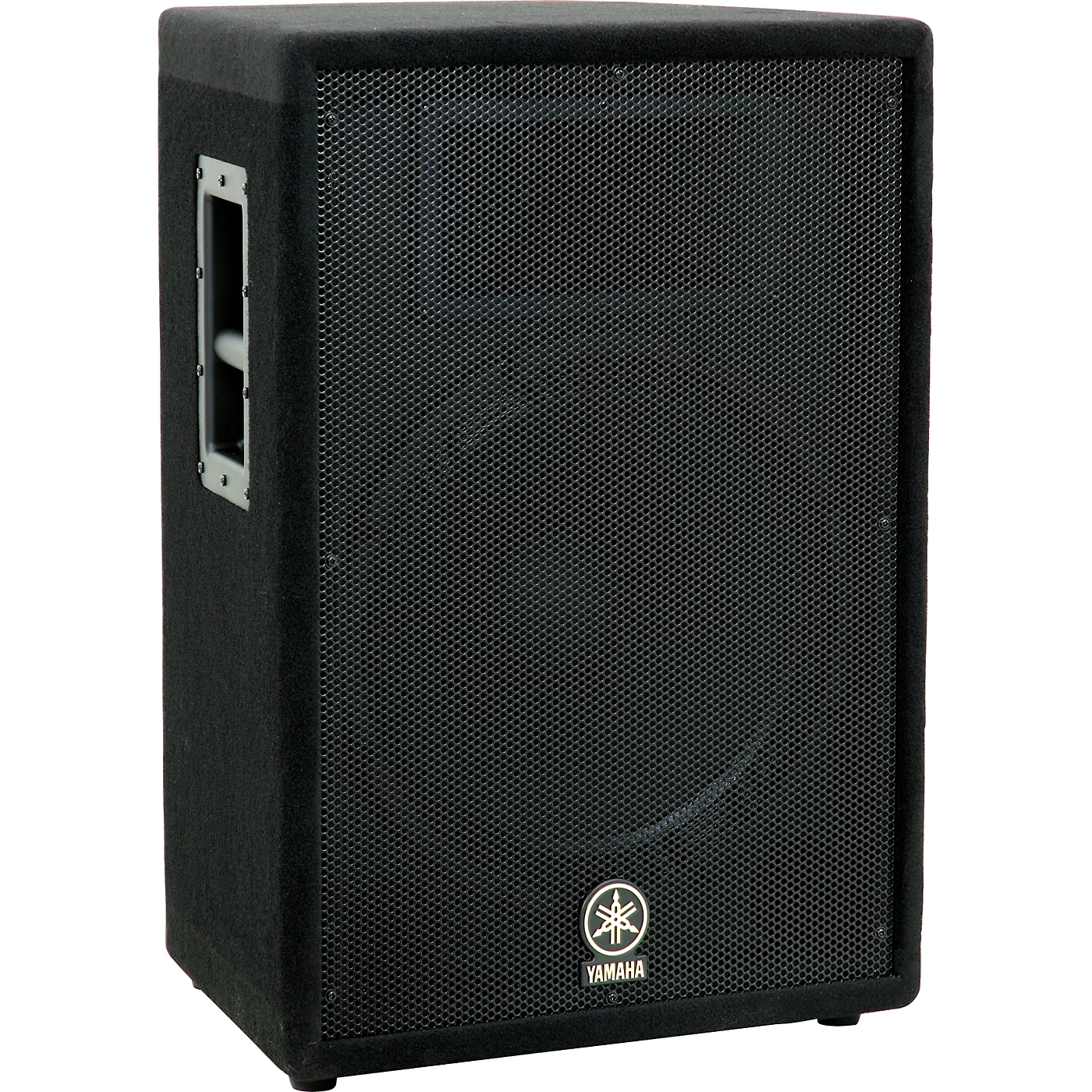 The Yamaha A15 speaker from the A Series is designed for live PA system use. It is a 2-way speaker featuring bass reflex, trapezoidal cab design, heavy grille, recessed side handles, and black carpet covering.The A15 has a 15″ woofer, 1″ high-frequency horn, and 400W/800W program/peak handling.