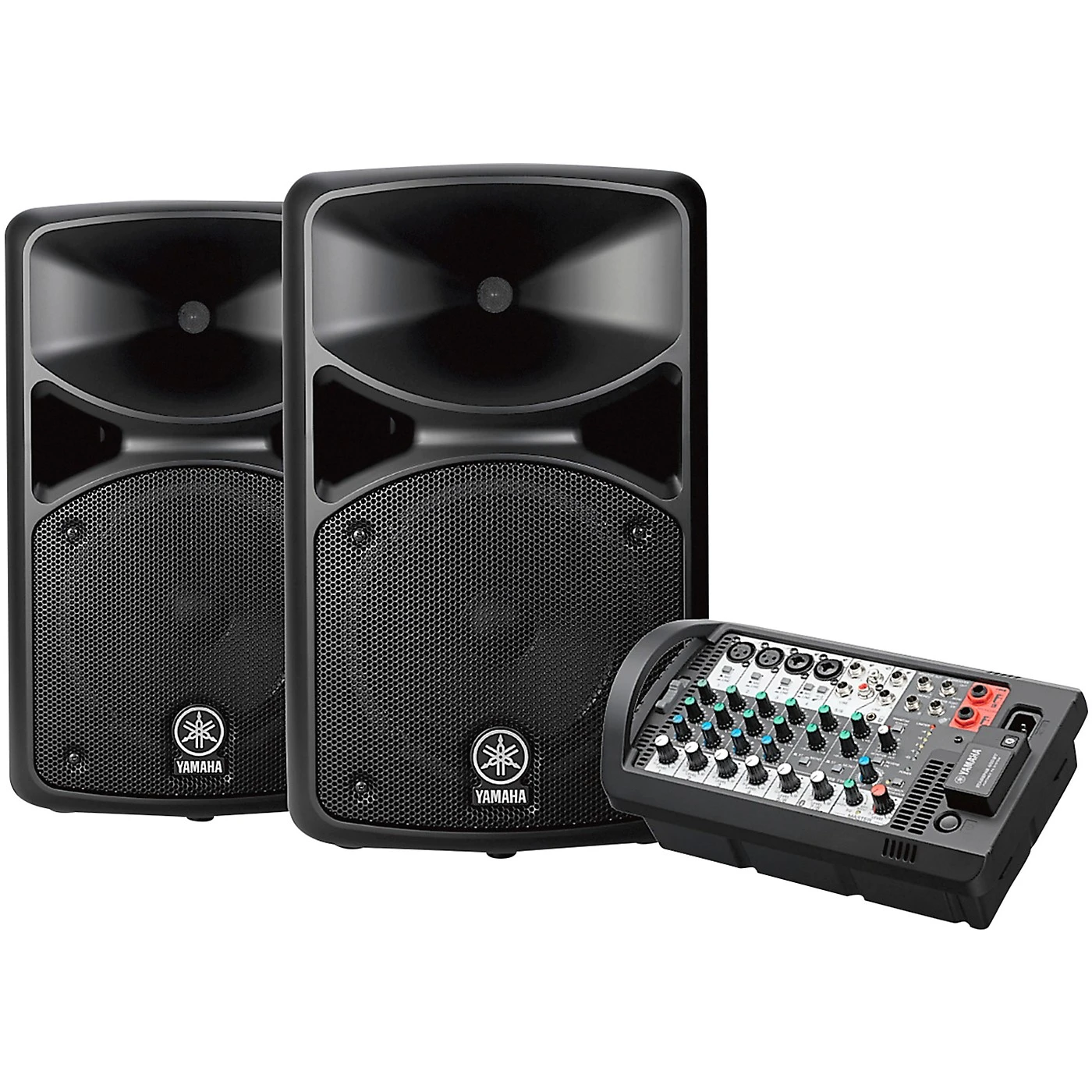 With Bluetooth connectivity, intuitive control and impressive sound quality, this all-in-one PA system builds on the STAGEPAS legacy of providing everything you need to transform any environment into your own personal stage. The STAGEPAS 400BT’s 8-channel powered mixer delivers 400 watts of peak output through its pair of 8″ full-range speakers for room-filling sound. Enjoy the freedom of wireless streaming thanks to Bluetooth connectivity. Onboard SPX digital reverbs, 1-knob master EQ with virtual bass boost, 2-band channel EQ and built-in feedback suppressor let you get your sound dialed in perfectly every time.With its intuitive, simple design, STAGEPAS 400BT can be set up and ready to go in a matter of seconds. Even users with no PA operation experience will be able to produce high-quality sound in under a minute. You can take it literally anywhere you want, since the all-in-one STAGEPAS 400BT is compact and light enough to carry by hand. The two lightweight speakers, detachable mixer, and pair of speaker cables and power cord all combine to create an attractive, compact package that provides the kind of portability and simplicity of which no roadie would ever dare to dream.Flexible enough to be used in a truly impressive range of environments and applications, STAGEPAS systems can be set up in a variety of PA and monitoring configurations. Equipped with a Bluetooth input for wireless audio streaming from smartphones or tablets, the STAGEPAS 400BT lets you seamlessly play backing tracks for gigs or set the tone for parties, conferences, or events with the audio playback of your choice.With onboard SPX digital reverb, one knob gives you access to four different high-quality reverb settings, perfect for vocals and acoustic instruments. Simply turn the knob to change the reverb type and time, and then you’re ready to apply just the right amount of high-resolution effect to each channel.One-knob EQ functionality gives you instant mastery of your mix, allowing you to match your sound to your surroundings. Simply turn the knob to optimize the EQ for speaking engagements, musical performances, or just to kick in more bass; getting your sound right has never been so easy.Yamaha’s built-in feedback suppression allows you to avoid the uncomfortable feedback that plagues so many sound reinforcement novices and professionals alike. Usually found only on high-end gear, this intelligent function removes feedback automatically with the push of a button, giving you a clear, professional sound.